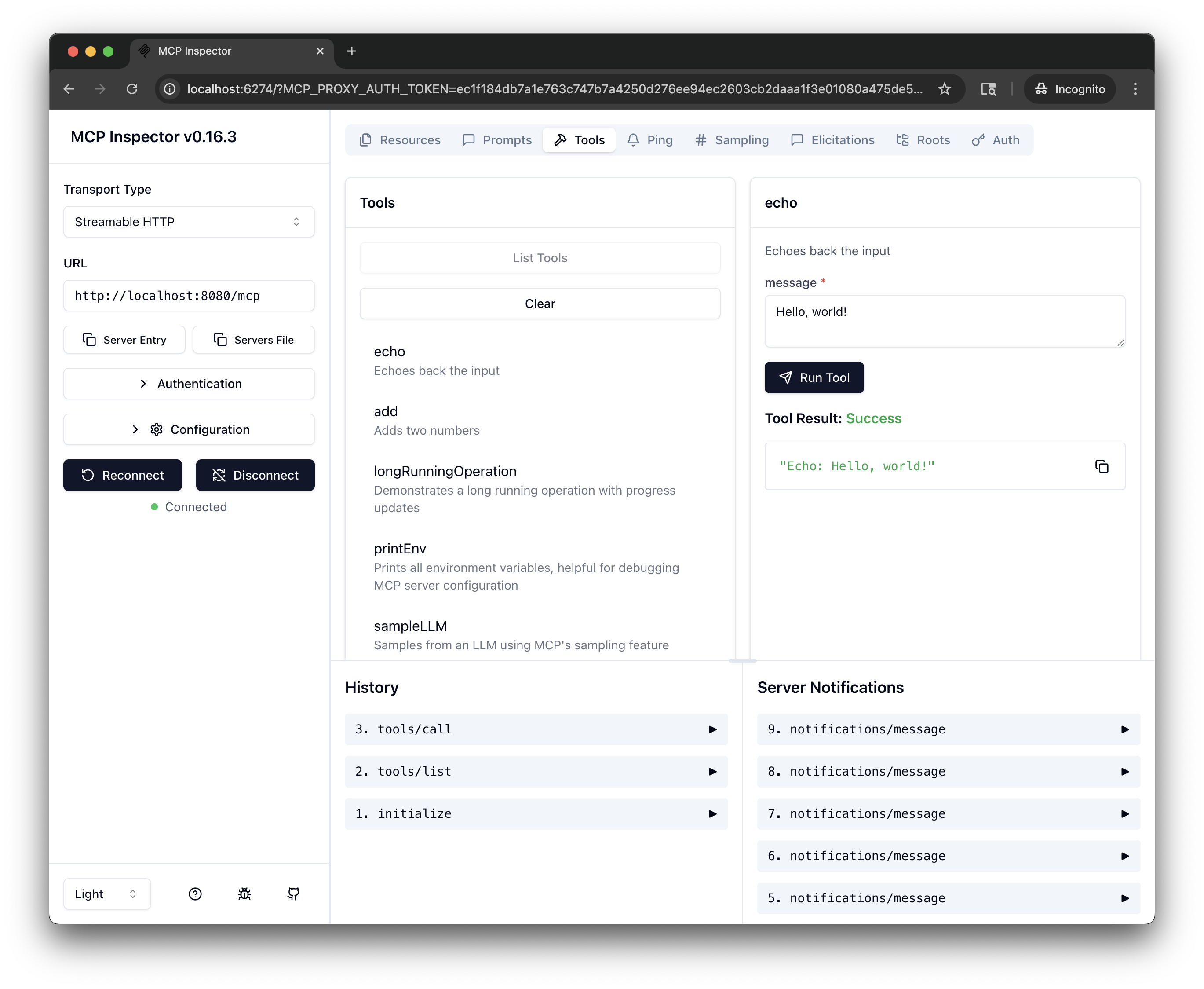 5. Test the tools: Select a tool, such as echo. In the message field, enter a message, such as Hello, world!, and click Run Tool.